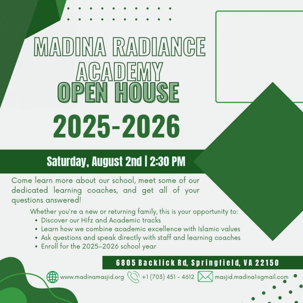 Home Welcome to Madina Islamic Center Open to all, affiliated with none! We value diversity, inclusiveness, service, spiritual and academic growth, empowerment, and building a strong community as our mission. About Us Jummah (Friday Prayers): 12:30 PM, 1:30 PM, 2:30 PM, and 3:30 PMNote: Iqamah for each Friday prayer will be within 15-20 minutes of above timings. Bringing the Radiance of Madina to Our Community Situated in Northern Virginia, our main focus is to uplift our community and provide a positive environment for growth and improvement. Located just outside of the nation’s capitol The vibrant spirit of Madina